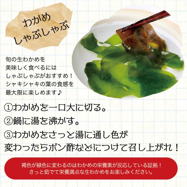 しゃぶしゃぶや海藻サラダ、わかめのお刺身などで、シャキシャキ食感の生わかめをお楽しみください。