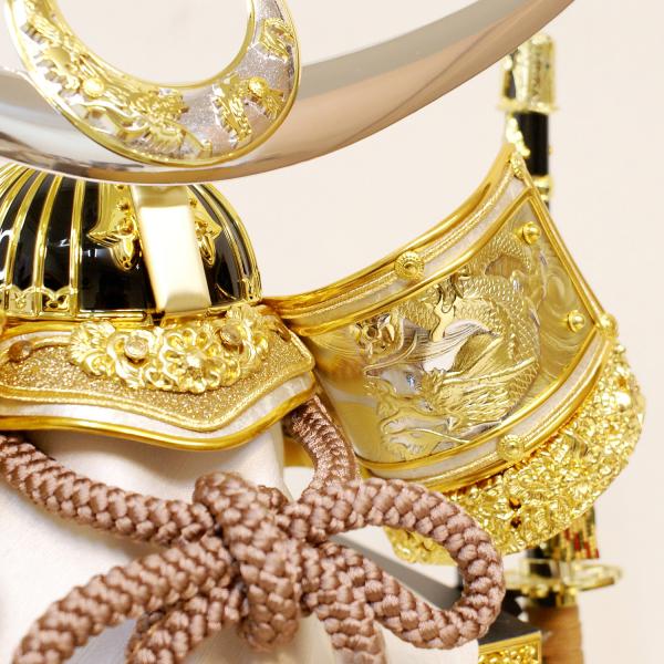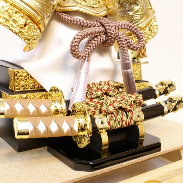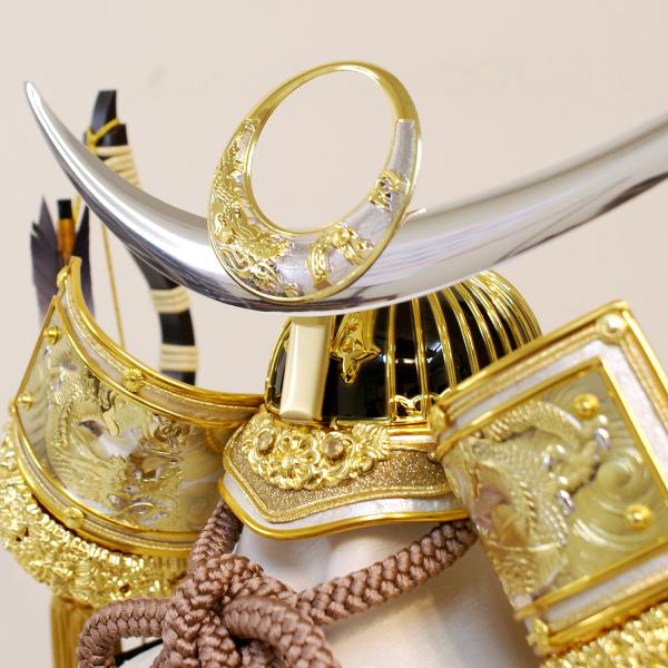 上杉の日輪三日月前立てにも装飾を施し、前飾りに太刀を2本飾った久月がこだわって造った逸品です。