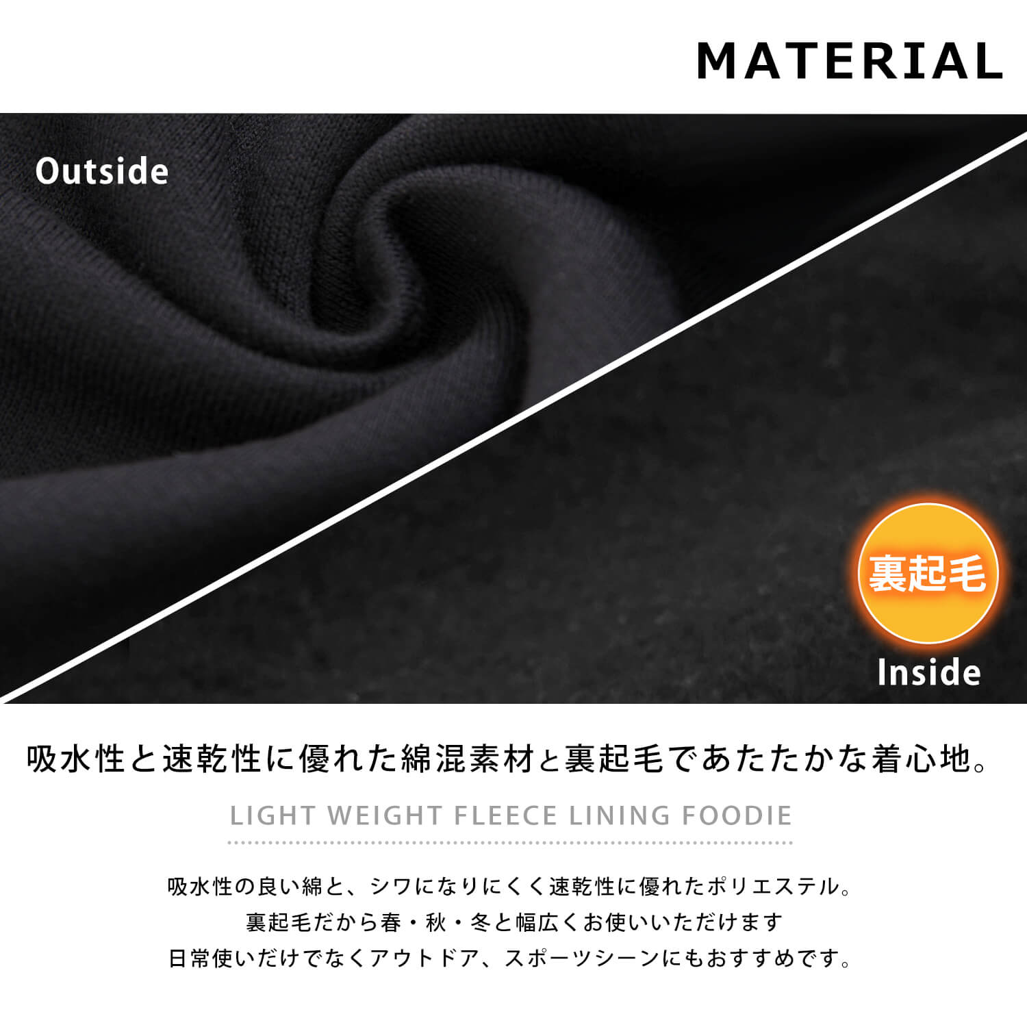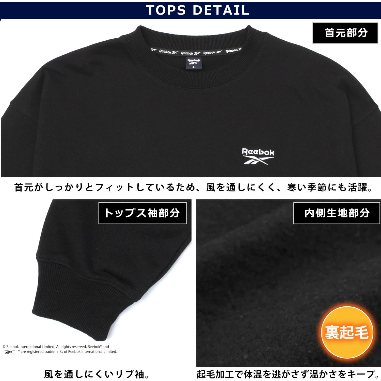 生地には、保温性と柔らかさに優れたTC裏起毛素材(ポリエステル65%、コットン35%、280g)を使用。