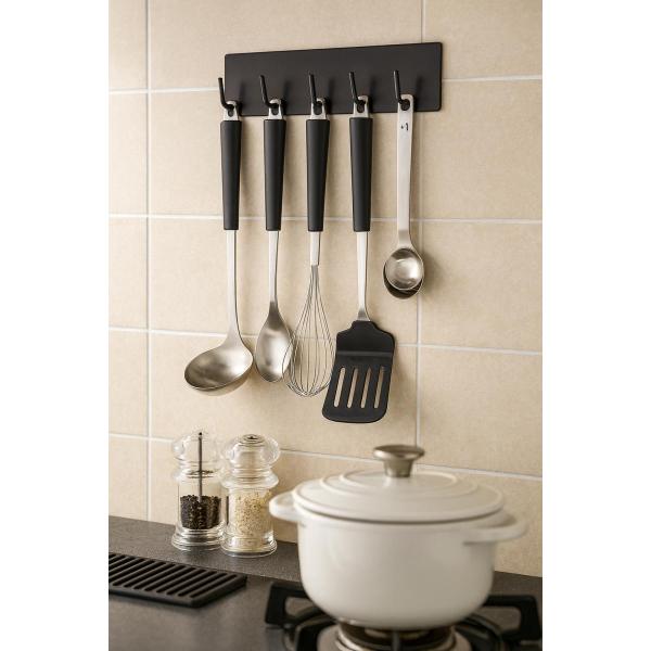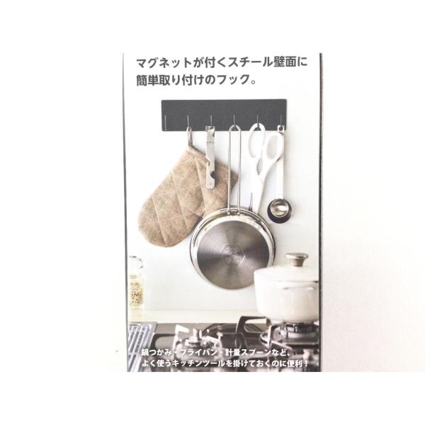 フックの数は6つで、よく使う調理道具はもちろん計量スプーンや小物類、ミトンなどもまとめて吊り下げておけます。