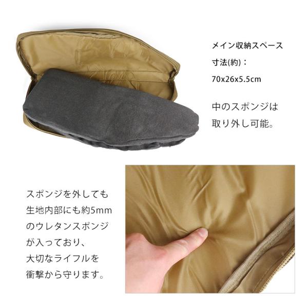中には取り外し可能な厚手のスポンジクッション入り。クッションを外しても、生地内部には約5mmのウレタンスポンジが入っており、大切なライフルを衝撃から守ります。