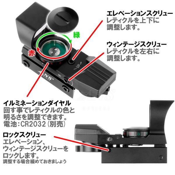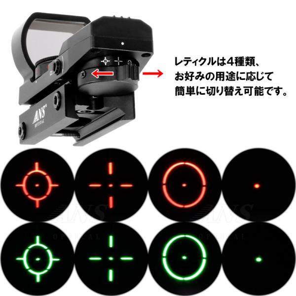 レティクル:4種レティクル切替可能。レッド・グリーン切り替えでシーンに合わせて細かく調整できます。