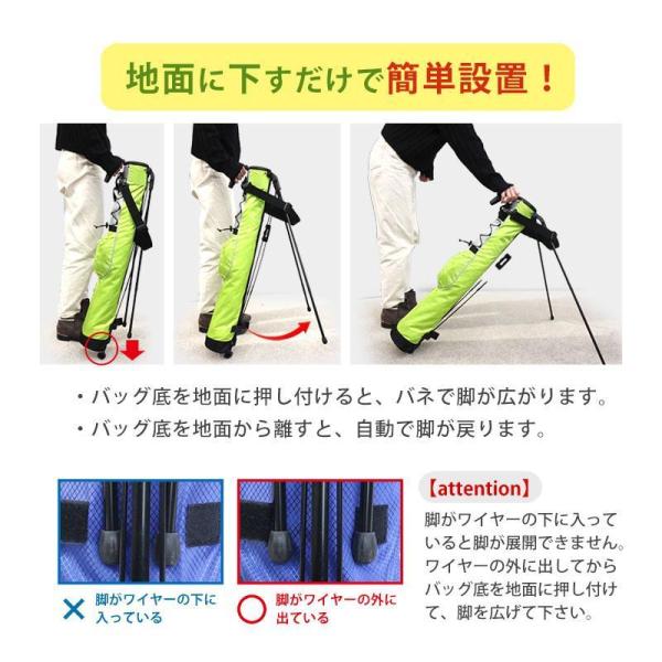 バッグ底を地面に押し付けると2本の脚が広がります。このスタンドを使用すれば夜露や雨上がりのグリーンでも、乾いたグリップでクラブを使用できます。クラブをサッと取り出せるので時間の短縮にもなります。