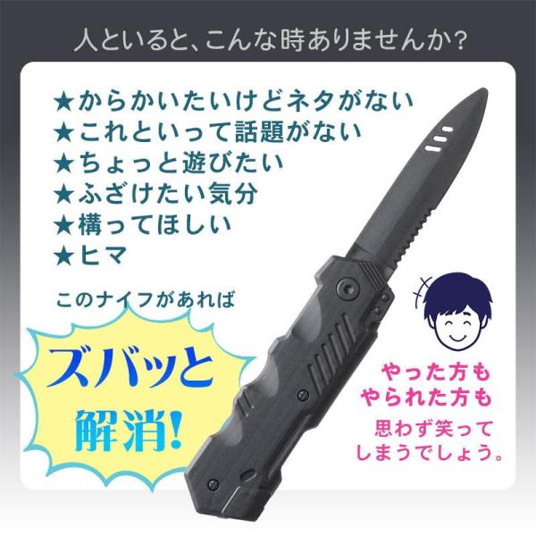 ◆プレゼントに最高!◆自分で買わなくても貰ったら嬉しい、そんなアイテムなので贈答品や景品にしても喜ばれます。笑いがとりたい時にピッタリです。普通のナイフではなくサバイバルナイフの形状でカッコ良く、子供にも喜ばれます。