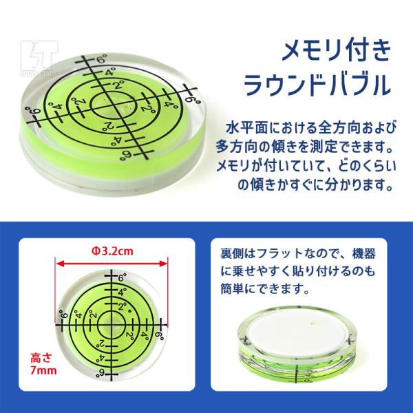 【サイズ】ミニラウンドバブル:φ10x6mm、メモリ付きラウンドバブル:φ32x7mm、 キーホルダー型水平器:□10x100mm