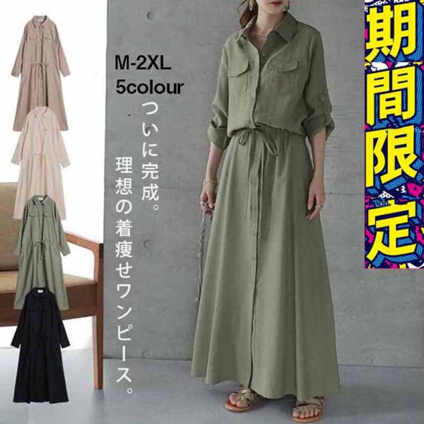 ワンピースロングワンピースシャツワンピース シャツブラウス ワンピ ロングマキシワンピース レディース 長袖 羽織 大きいサイズ 黒 ベージュ きれいめ 春 夏