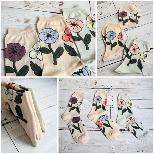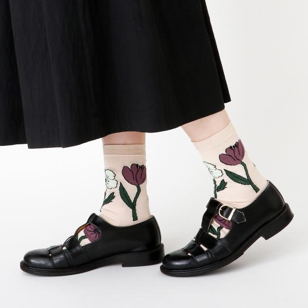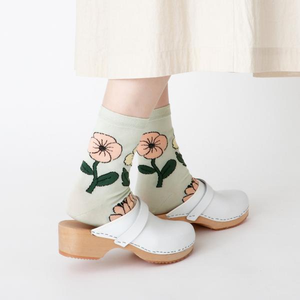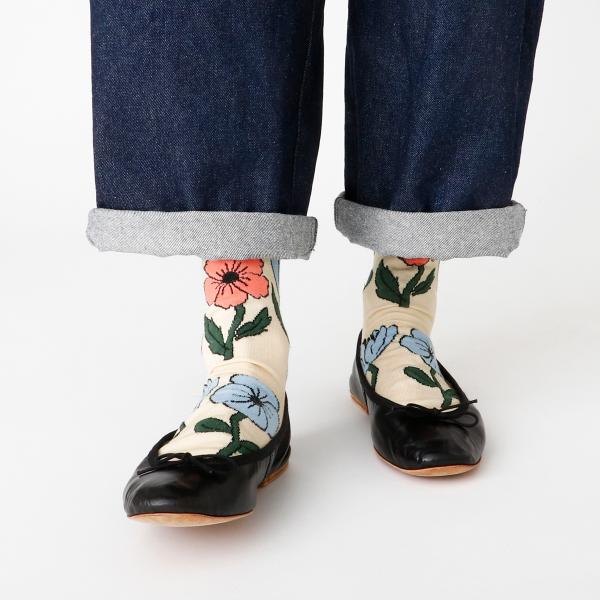 並んだお花がゆらゆらと風に揺られてダンスをしているような柄のソックスです。ベースはガス焼き処理により毛羽を抑えたシルケットの綿糸で、薄く編み立てました。優しいペールトーンをベースにした春夏らしい配色が足元を華やかにしてくれる1足です。足元を主役にしたスタイリングも素敵ですね♪