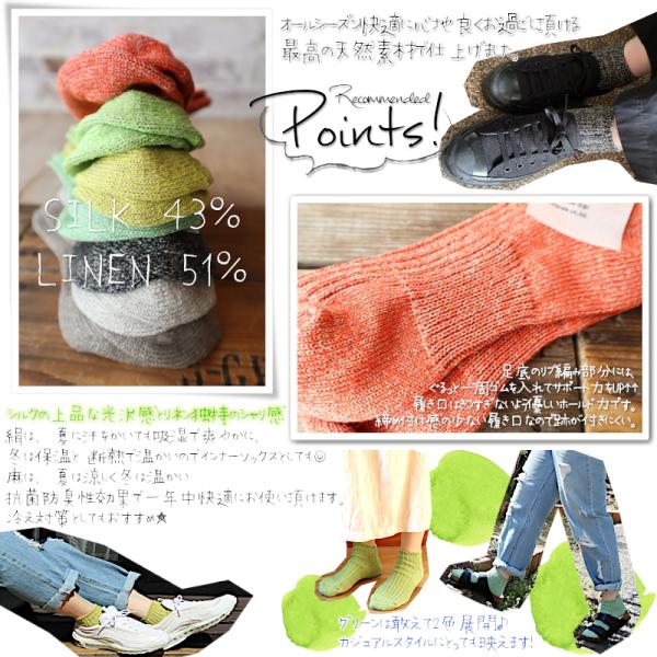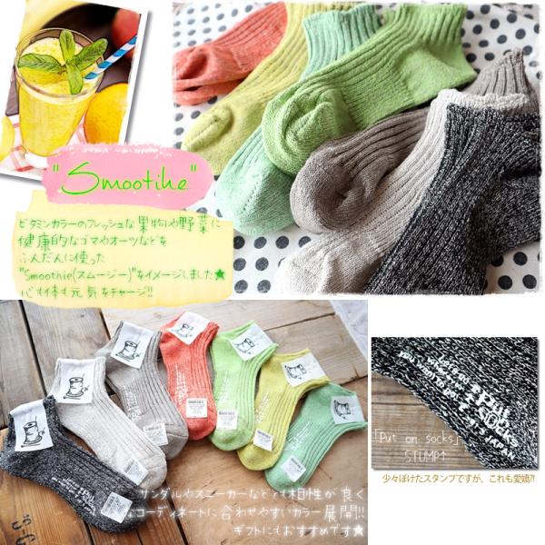 ビタミンカラーのフレッシュな果物や野菜に健康的なゴマやオーツなどをふんだんに使った"Smoothie(スムージー)"をイメージ★サンダルやスニーカーなどとも相性が良く合わせやすいカラー展開。足底のリブ編み部分には、ぐるっと一周ゴムを入れてサポート力をUP↑履き口はきつすぎないよう優しいホールド力です。締め付け感の少ない履き口なので跡が付きにくい。シルク混紡率 43%!絹は、夏に汗をかいても吸湿で爽やかに、冬は保温と断熱で温かいのでインナーソックスとしても◎ずっと履いていたくなる気持ち良さ。素足より快適!リネン混紡率 51%!麻は、夏は涼しく冬は温かい 抗菌防臭性効果で一年中快適にお使い頂けます。1年中着心地がとても良い最高の天然素材で仕上げました。日本製。