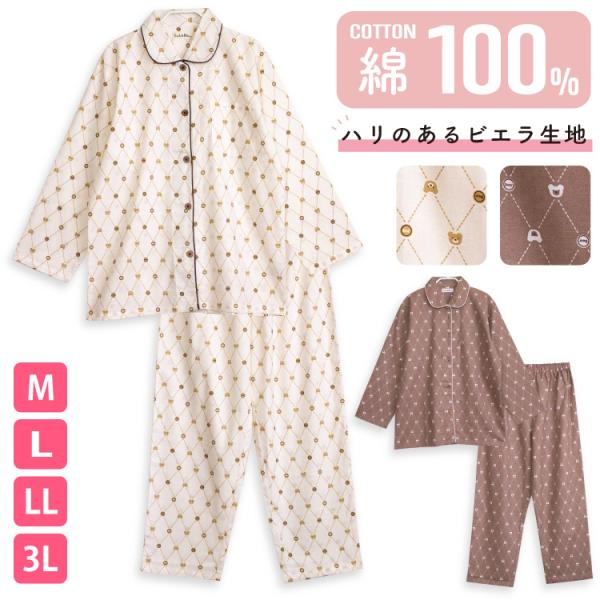 パジャマ レディース 綿100% 長袖 春 秋 前開き ボタン ほのぼのモノグラム クマ柄 M L LL 3L おそろい