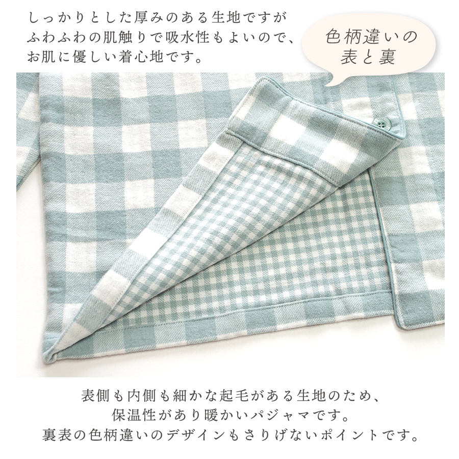 表側も内側も細かな起毛がある生地のため、保温性があり暖かいパジャマです。