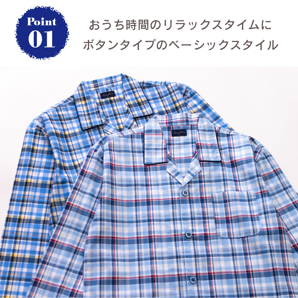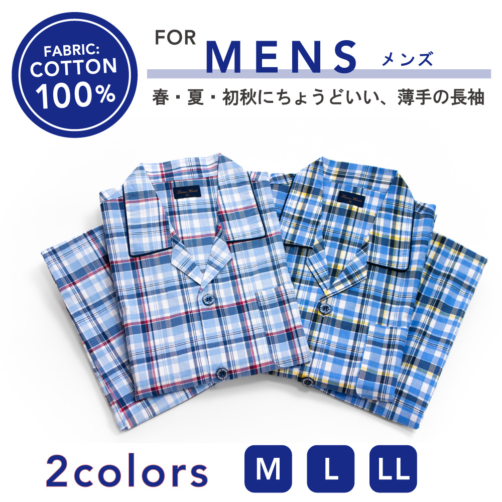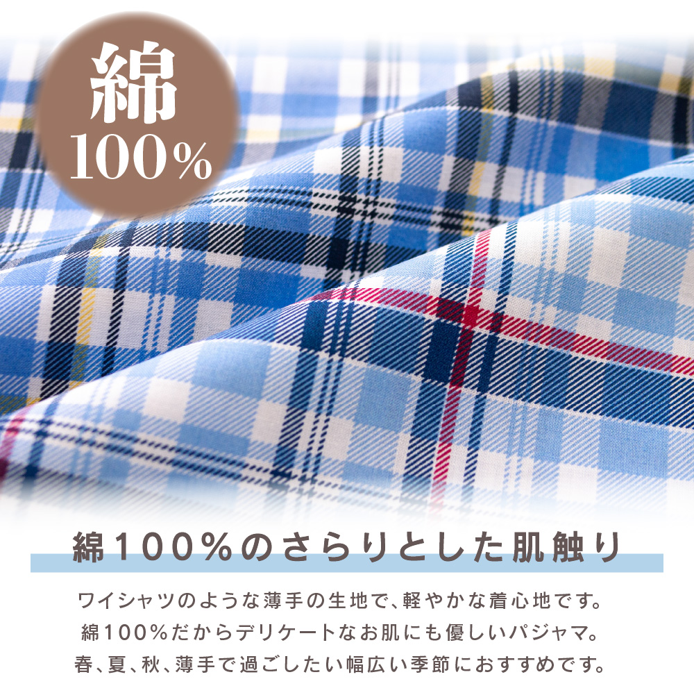 パジャマ メンズ 綿100% 長袖 春 夏 初秋 前開き ボタン チェック柄 薄手のシャツ M L LL おそろい プレゼント 父の日