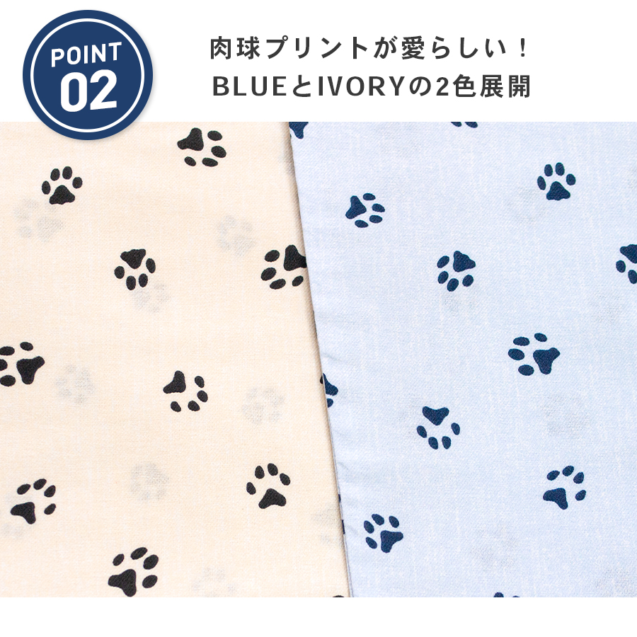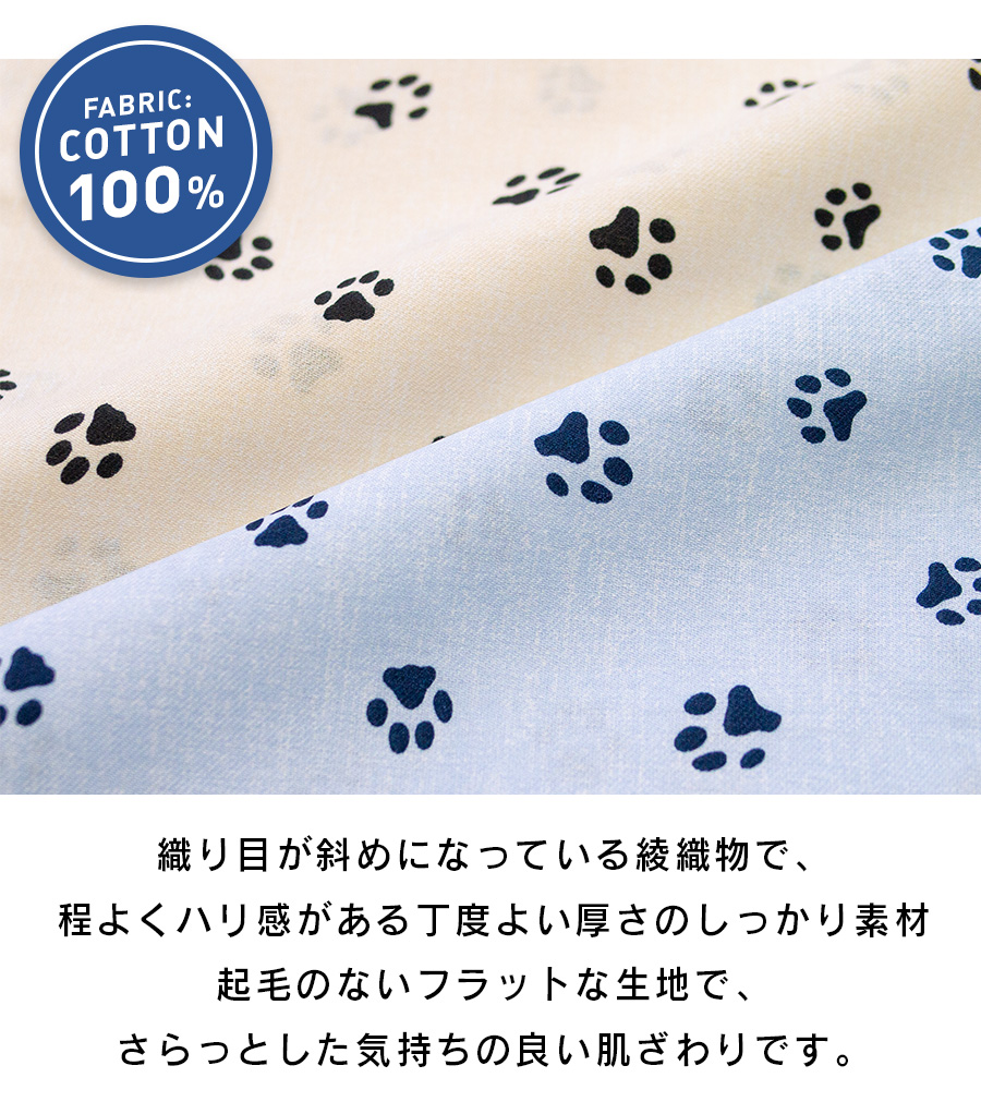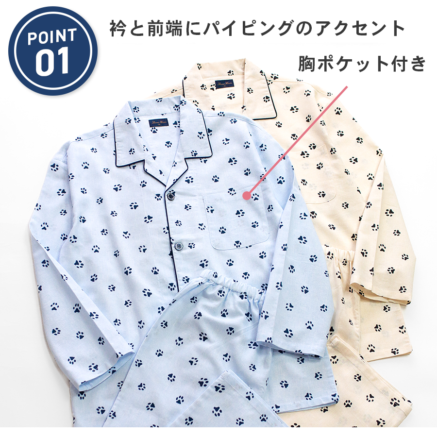 肉球プリントが愛らしい、シンプルなアニマル柄です。選べるカラーは落ち着いた雰囲気の穏やかなブルーと温かみのあるアイボリーの2種類です。3L・4L・5Lの大きめパジャマです。