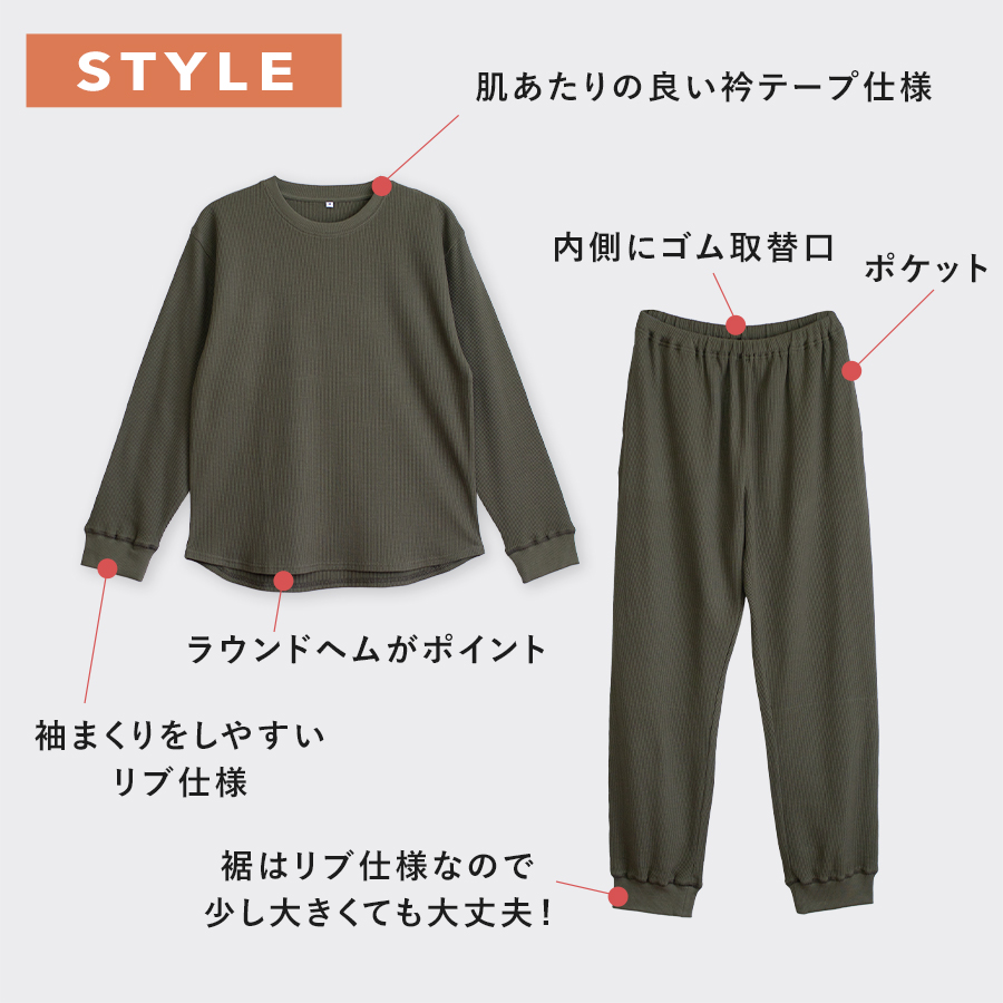 着心地のやわらかな綿100%ワッフル生地でできた、柔軟性と伸縮性に優れたルームウェア・パジャマです。