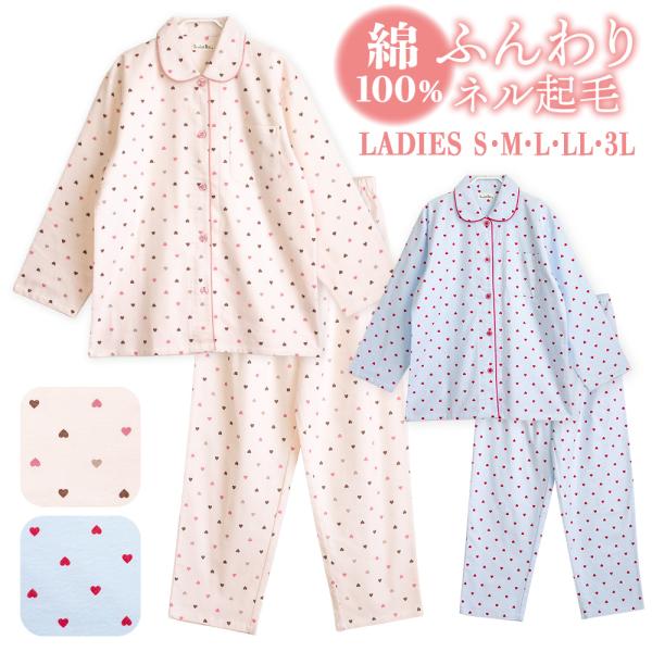 パジャマ レディース 綿100% 長袖 冬 前開き ボタン ネル起毛 前開き ボタン ハートドット柄 かわいい 親子 おそろい