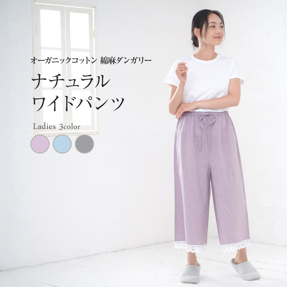 綿麻 ナチュラルワイド パンツ リラックス ルームウェア パジャマ ボトム オーガニックコットンにリネン麻を織り込んだ素材 日本製 母の日 ギフト 0605