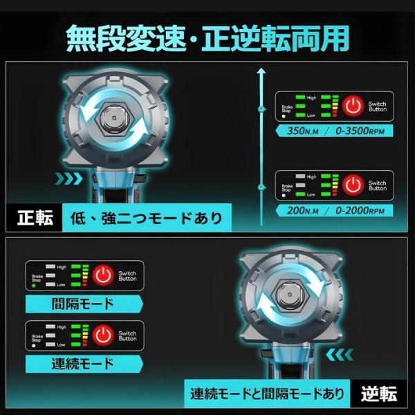無段変速・正逆転両用:電動レンチ正逆転レバーの位置を調整することで、ビットの回転方向を切