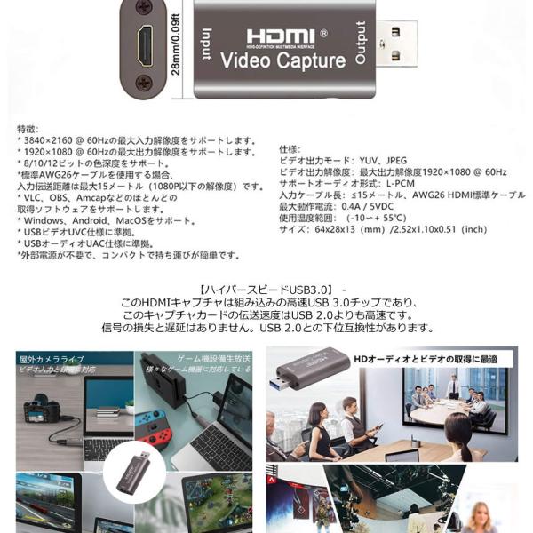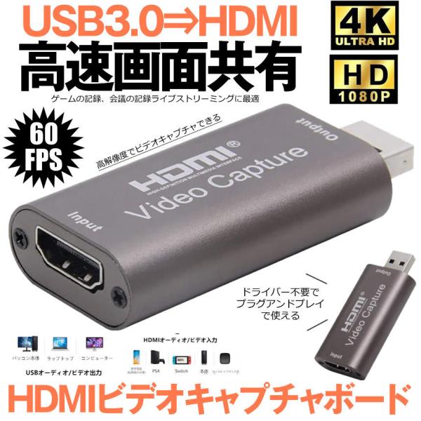 HDMI キャプチャーボード USB 3.0 ビデオ キャプチャー ゲーム 実況 配信 オンライン リモート 会議 ライブ 録画 コンパクト パソコン PC 簡単 接続 HDHENKAN