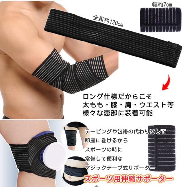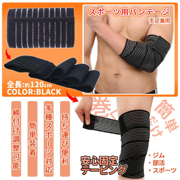 サポーター テーピング バンテージ マジックテープ 黒 120cm 1枚 伸縮 バンド 怪我防止 むくみ解消 足 膝 肘 太もも ふくらはぎ スポーツ トレーニング ELLSAPO