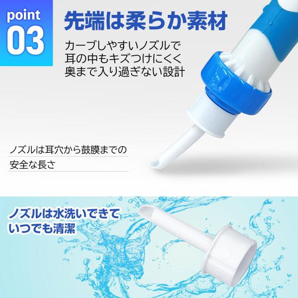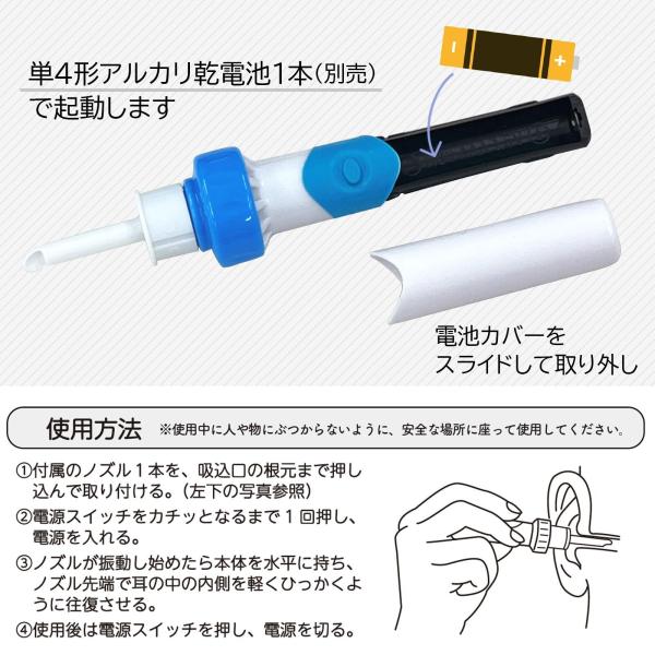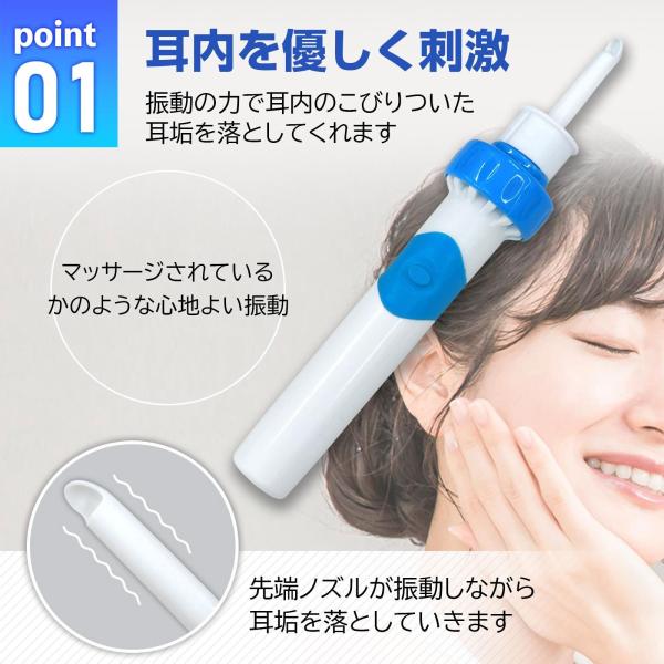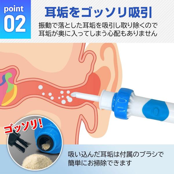 振動で耳内を優しく刺激し、落とした耳垢を吸引して取り除く!!吸い込んだ後は付属のブラシで簡単にお手入れできます。先端は柔らか素材なので耳の中もキズつけにくい。ノズルは水洗いできていつでも清潔。