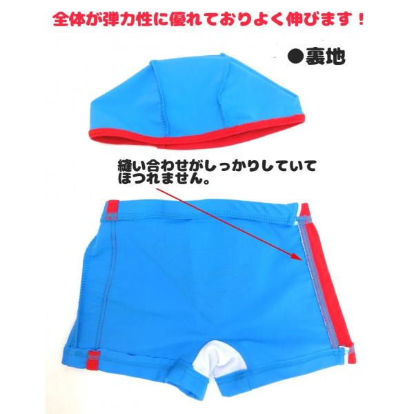 男の子用デザインの、スイムパンツとキャップ(帽子)の2点セットです。