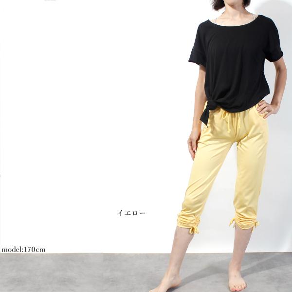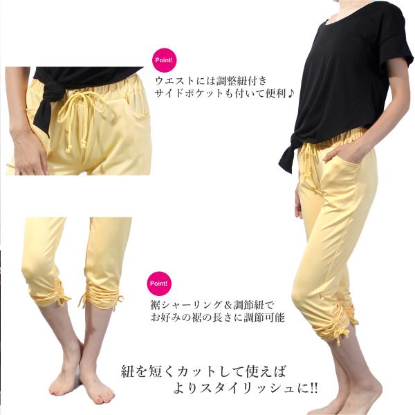 6カラーで再入荷☆裾ひも&シャーリングで、裾をお好みの長さに調整できます。裾がキュートなので、レギンスとしてもおすすめです。吸汗速乾性のあるストレッチ生地を使用しているのでヨガ・フィットネス・ウオーキングなどさまざまなスポーツを快適に楽しむ事ができます。ルームウエアやファッションアイテムとしてもおすすめです。