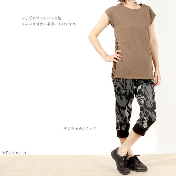 7分丈で軽快な着こなしができる太めサイドライン入りのジョガーパンツ。無地タイプは薄手のソフトスウェット生地、柄タイプはジャガード織生地を使用。サイドラインの色切替えを楽しめる無地タイプと、シックなカモフラ柄がおしゃれな柄タイプからお選び頂けます。前両サイド&右後ろににポケットつき、ウエストはゴム・内スピンドルつきで調節可能。