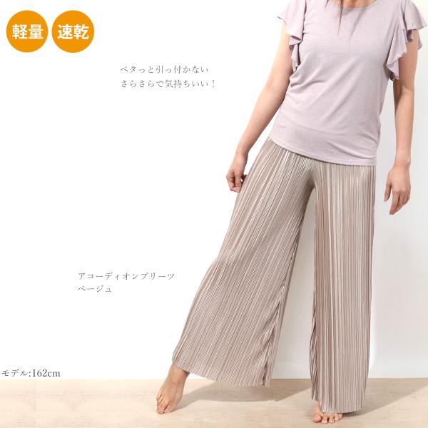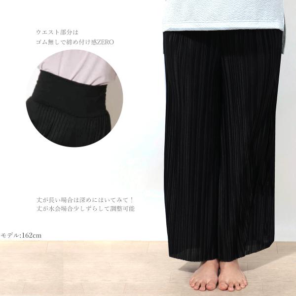 歩く度にさらさら揺れるエレガントなプリーツ。ひらひらと広がったシルエットで優美なヨガスタイルに。お腹が冷えない股上深めの安心構造で、ウエスト部分はゴムなしで締めつけ感なし。トップスをインすれば、今旬なウエストマークもラクチン&スマートに決まります。裾はお好みの長さにカット可能。