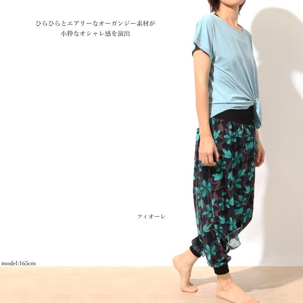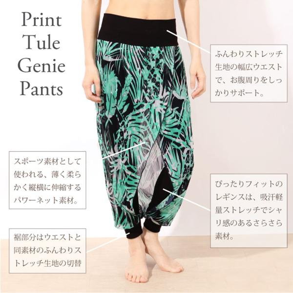 ぴったりフィットのレギンスにプリントチュールをレイヤード。ふんわりとした質感・透け感で柔らかい雰囲気に。レギンス部分は軽量の吸汗速乾ストレッチ生地で快適にヨガを楽しめます。