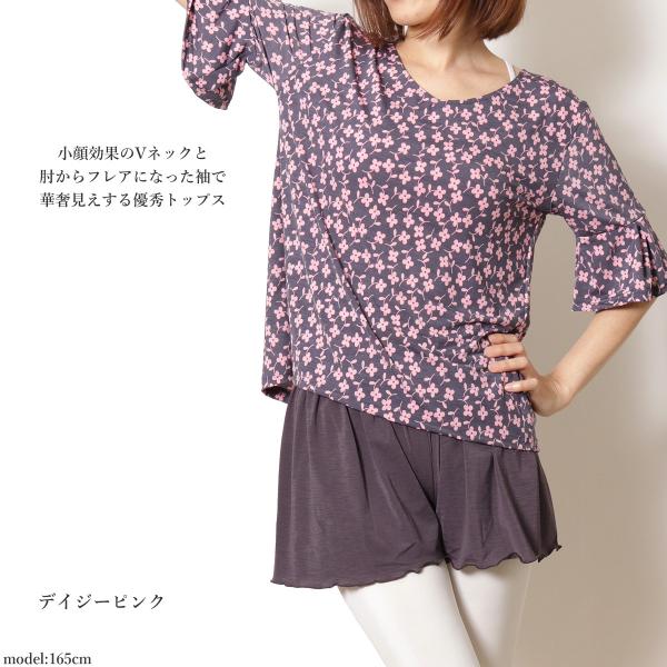 小顔効果のVネックと肘からフレアになった袖で華奢見えする優秀トップス。