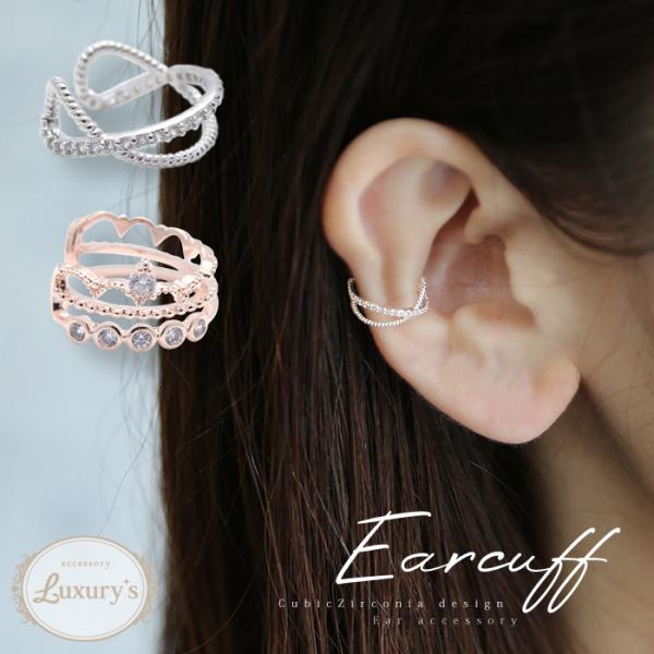 イヤーカフ イヤカフ 片耳用 1点売り イヤーカフス キュービック ジルコニア CZ 痛くない 簡単 王冠 クラウン レース クロス 2連風 Luxury's ラグリーズ