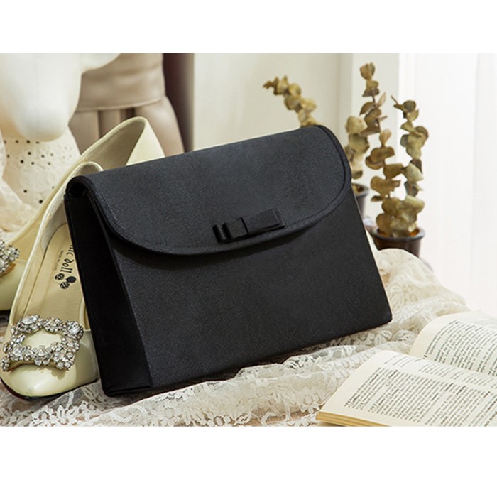 小さなリボンが中央についたシンプルバッグ。マチは薄めでコンパクトですが、幅と高さがしっかりあるので、ふくさもきちんと収まります。