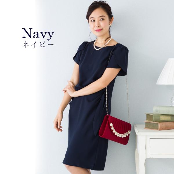 どんなシーンにも対応できる、大人っぽいパーティードレスです。ウエスト部分のドレープが気になるお腹周りをカバー!安心のひざ丈、ハイウエストリボンでで脚長効果も!