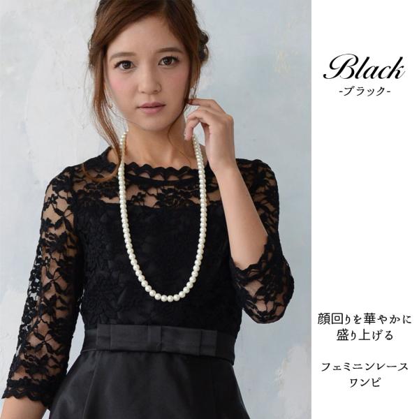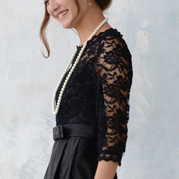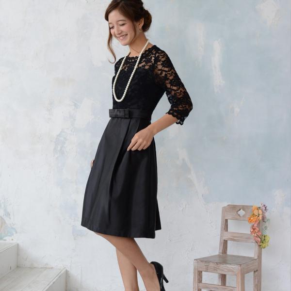 エレガントなパーティードレスです。ふんわりとしたスカートが気になる下半身をカバー!安心のひざ丈ワンピースです。ウエストリボンで可愛さもUP!少しだけ見える鎖骨肌見せがセクシーに!