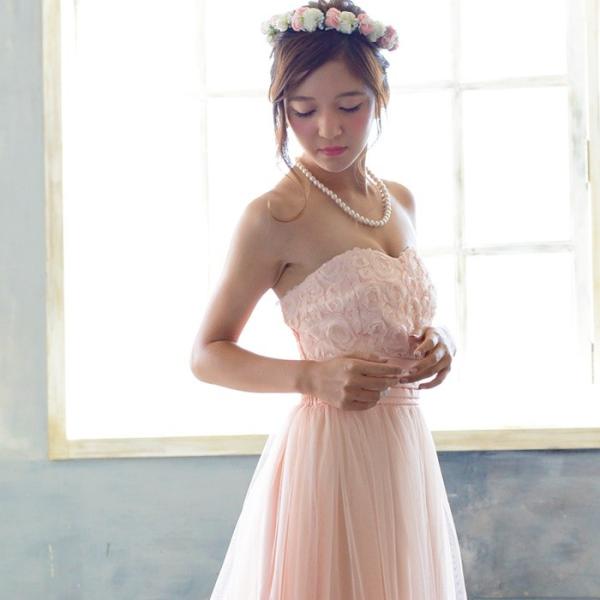 ハイウエスト切替が脚長見せのポイント!上品なホワイトとピンクは新婦用のドレスとしてもGOOD!夜の披露宴にはもピッタリのドレスです。後ろはゴムなので胸元でしっかりホールド。ずり落ちが心配な方は、付属の透明ストラップをお使い下さい。