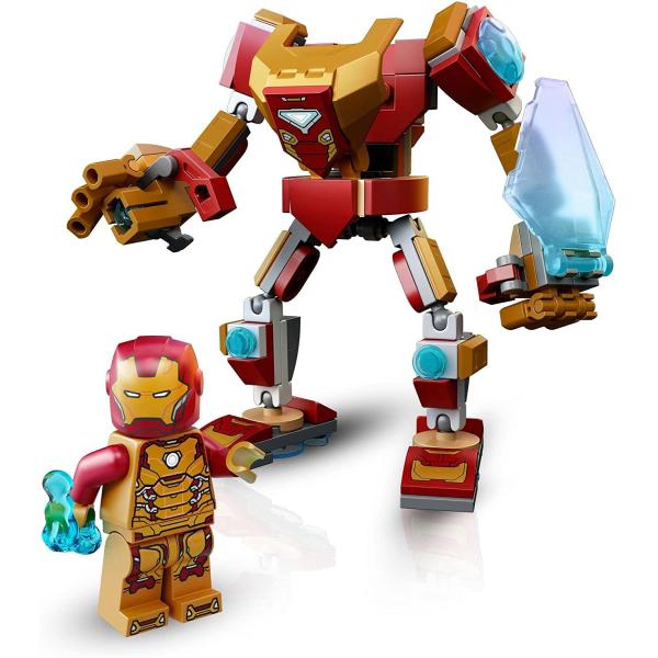 アイアンマン・メカスーツは、スタッドシューター、エネルギーシールドを装備し、手足の連結部を動かせます。アイアンマン のミニフィギュアが付属しています。