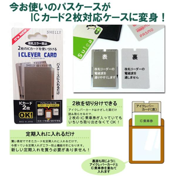 薄い素材でできたカードを定期入れに入れるだけで、定期入れがsuica、pasmo、icocaなどの2枚のICカード乗車券を入れたまま切り替えて使える便利なパスケースに早替わり!両面タイプの定期入れをお使いであれば、新しい定期入れを買う必要がなく経済的!アイクレバーカードはかざした面だけ読み取らせるので、2枚のIC乗車券が入っていてもいちいち取り出さなくてOK!