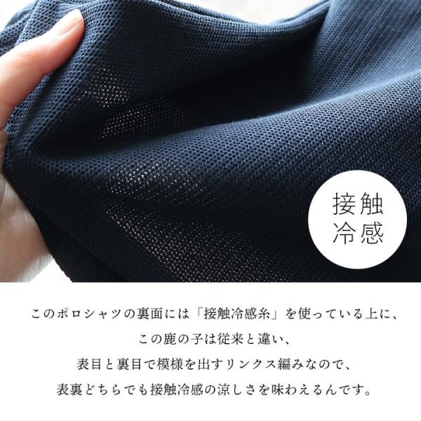 ・このポロシャツの裏面には「接触冷感糸」を使っている上に、この鹿の子は従来と違い、表目と裏目で模様を出すリンクス編みなので、表裏どちらでも接触冷感の涼しさを味わえるんです。