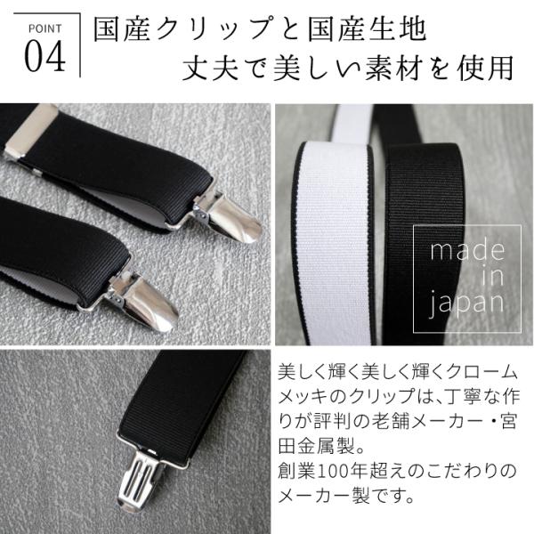 このサスペンダーには、国内NO1メーカーの宮田金属製クロームメッキの金具を使用してます。