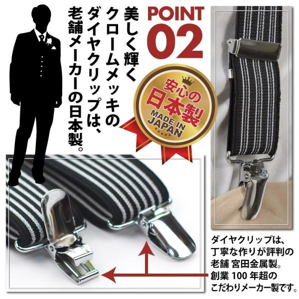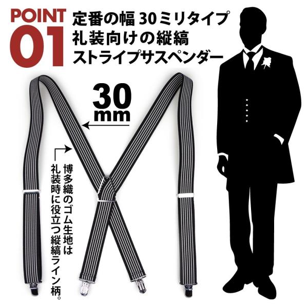 ■メンズサスペンダー 礼装ストライプ30ミリ幅です。博多織のゴム生地はフォーマル時に活躍の縦縞ライン。背中の交差部分に金属金具を使用している為、革を使用したものに比べて、コストパフォーマンスに優れると共に、色落ちの革による色落ちの心配も軽減させております。また、肩からのずり落ちが激しい場合などには交差部分の金具位置を調整いただき着用いただけます。