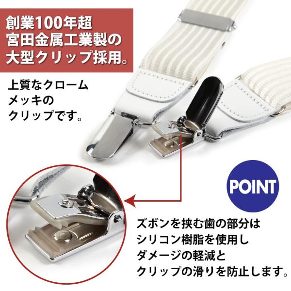■金具は全て老舗クリップメーカー:宮田金属興業製を使用。クロームメッキのクリップで、スムーズに開閉するので脱着が容易です。 内側にシリコン樹脂の保護材を使用し、クリップの滑りを防止しズボンの痛みを軽減します。