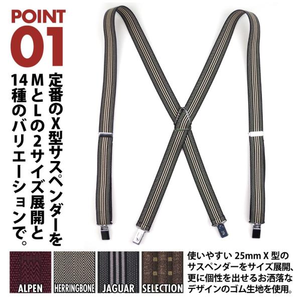 ■使いやすい定番の25mm幅メンズ・サスペンダーです。MとLの2サイズ展開で、お洒落なデザインのゴム生地(アルペン・ヘリンボーン・ジャガー・セレクションの4柄) の全14色のバリエーションで、個性を引き出せます。