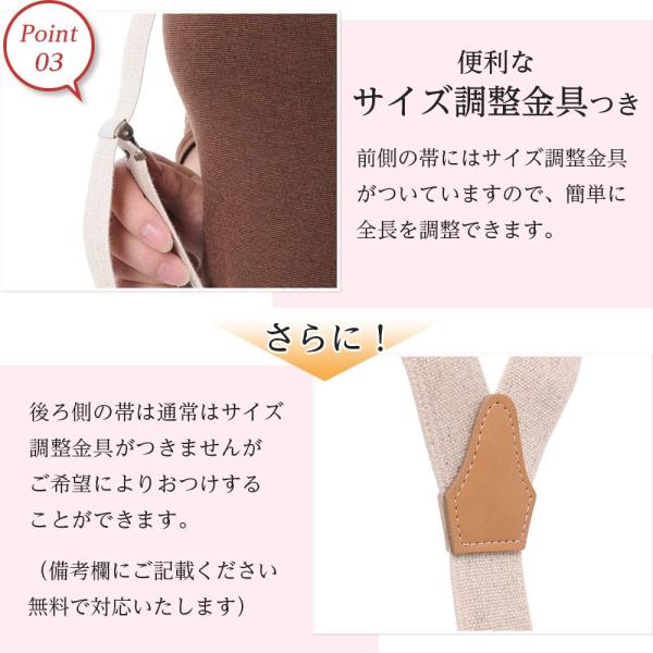 このサスペンダーは麻を織り込んだゴム生地素材を使用していますので、ふわっとしたナチュラルな仕上がりになっています。