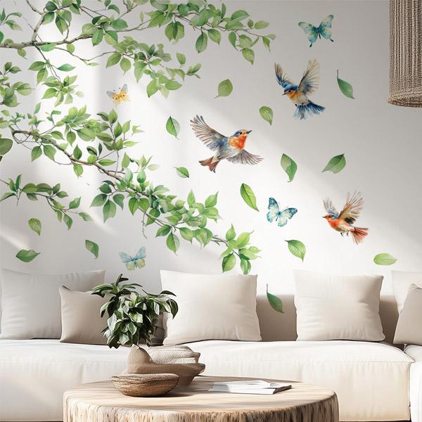 ウォールステッカー 木の枝 リーフ 小鳥 バード 初夏 フレッシュ グリーン アートステッカー インテリアシール DIY 剥がせる