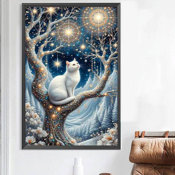 雪山の木に登って空を見上げる、幻想的な白猫のデザインです。
