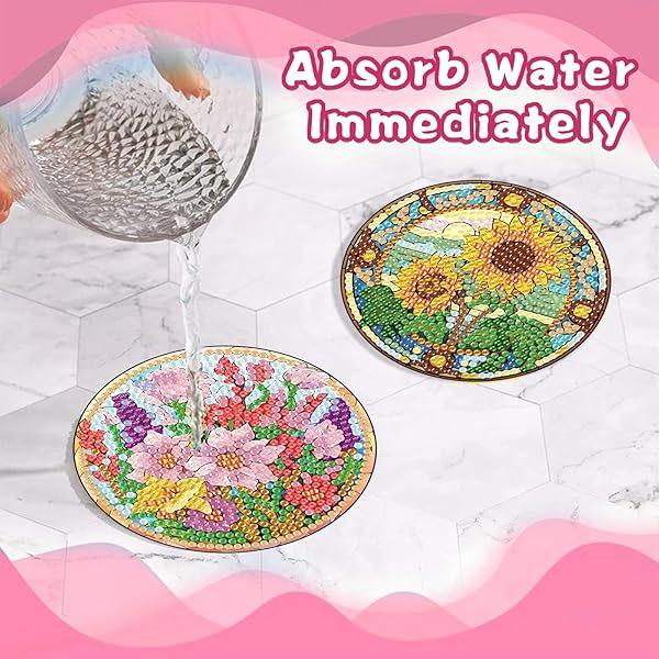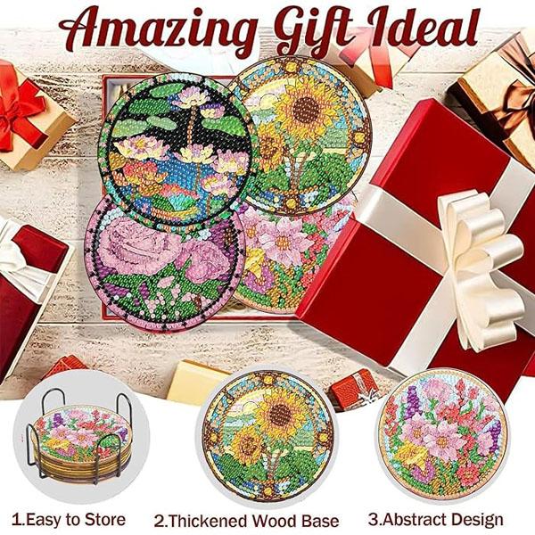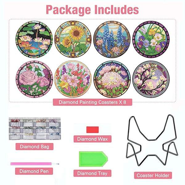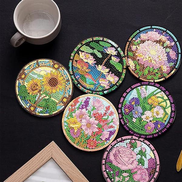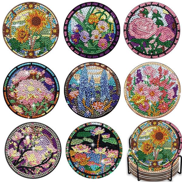 コースター 制作キット ダイヤモンドアート 8枚 ステンドグラス 花 ひまわり 薔薇 ホルダー付き ビーズ刺繍 モザイクアート リハビリ 趣味 絵画 ラインストーン