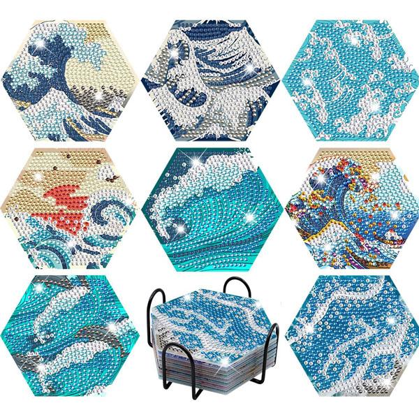 コースター 制作キット ダイヤモンドアート 8枚 六角形 白波 浮世絵風 和風 ホルダー付き ビーズ刺繍 モザイクアート リハビリ 趣味 絵画 ラインストーン