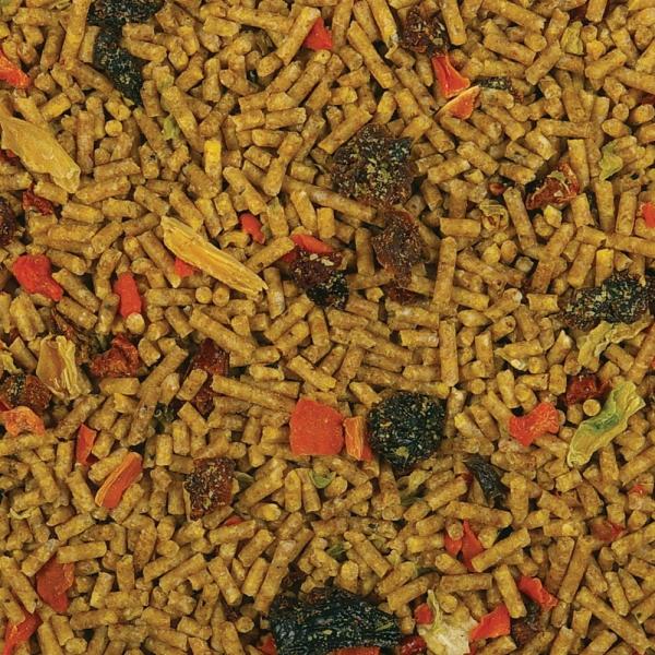 デイリーメンテナンスのペレットをベースに乾燥させたモモ・アプリコット・プラム・パプリカ・ニンジン・トマト・キャベツをブレンドしたモデルです。