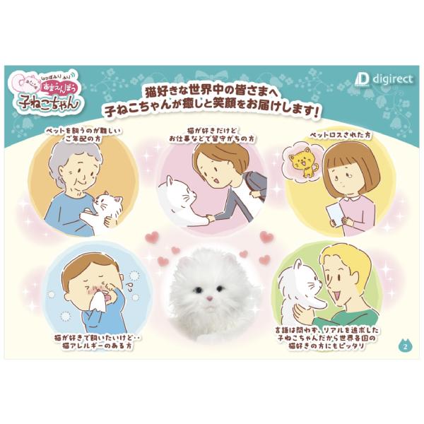 本物みたいな「しっぽ」の動きと、お目目を「パチパチ」、とっても愛らしい「鳴き声」で感情表現が豊かな、「子猫型ペットロボット」です。
