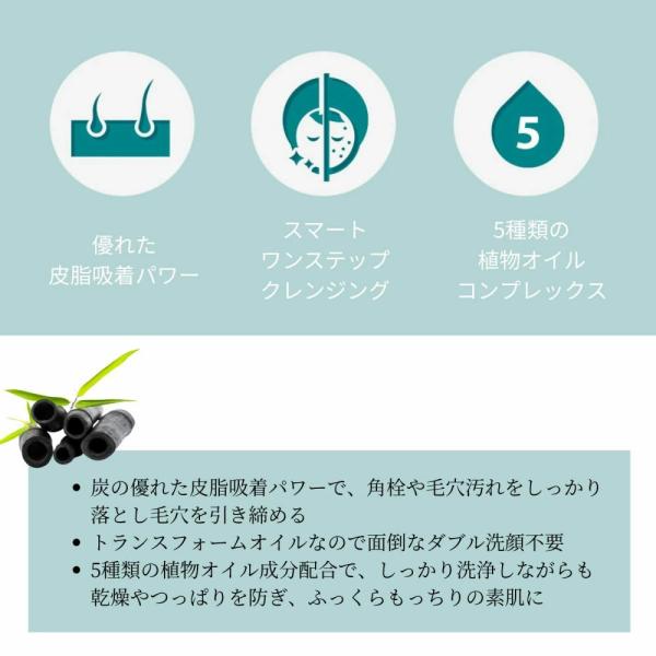 炭成分に加え、アルガン油・ホホバ油・ヒマワリ種子油などの5種類の植物オイルもプラス。しっかり洗浄しながらも、乾燥やつっぱりを防ぎ、ふっくらもっちりタマゴ肌に♪