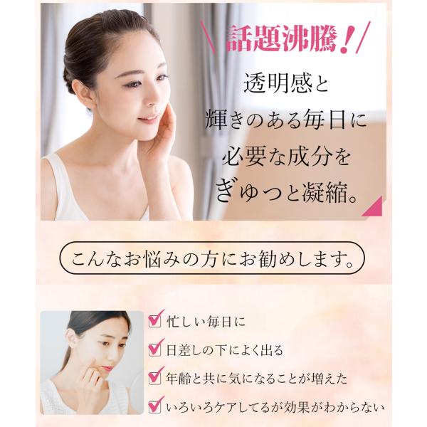 ビタミンC、ヒアルロン酸、ビタミンB2/ビタミンE、ニコチン酸アミド、ヘスペリジン